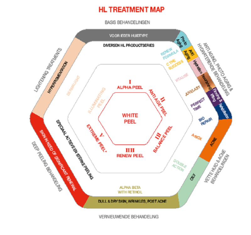 De kaart toont de mogelijke combinaties van HL PEELS voor verschillende huidtypes en salonbehandelingen.